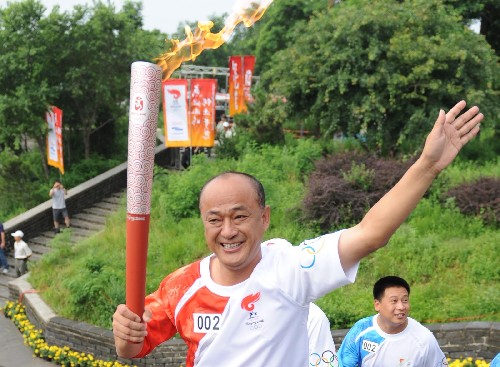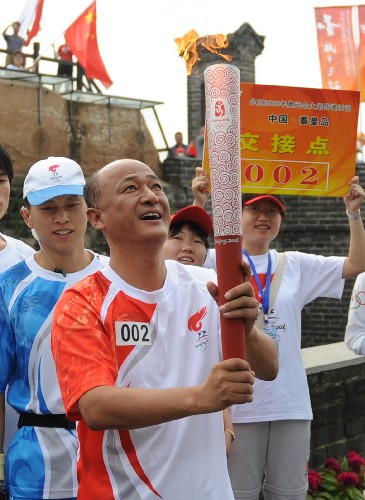 7月30日,火炬手聶瑞平手持火炬進行傳遞。當日,北京奧運圣火在河北省秦皇島市傳遞。新華社記者 楊世堯攝