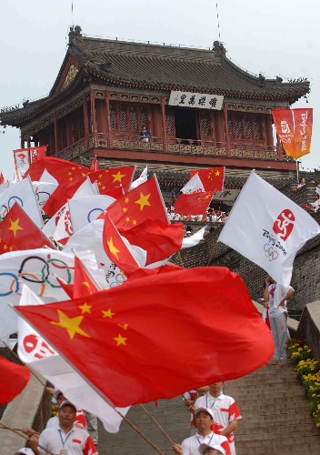 7月30日,人們在火炬傳遞起點老龍頭澄海樓前揮舞旗幟迎接圣火。新華社記者 鞏志宏 攝