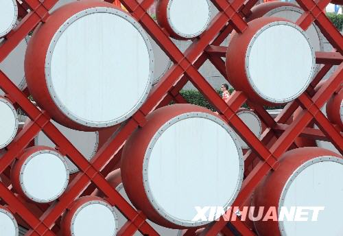 一名境外奧運工作人員從北京奧運中心區(qū)中國鼓造型的墻體旁經(jīng)過。新華社記者武巍攝