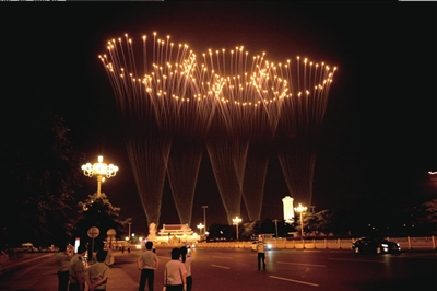 8點30分,“騰”的一聲,“五環(huán)”焰火在天安門城樓上空綻放,兩秒鐘,“五環(huán)”漸漸消失。這個五環(huán)圖案的焰火造型,由五輛軍用卡車安插的發(fā)射器發(fā)射而成。