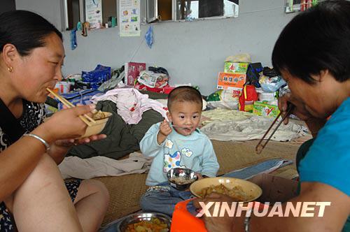 6月25日,在綿陽(yáng)九洲體育館,來(lái)自北川曲山鎮(zhèn)的蔣昕航宇(中)和伯母胡瓊(左)、奶奶一起吃飯。由于住房倒塌,蔣昕航宇的父母在汶川地震中不幸身亡。 新華社記者 金良快攝