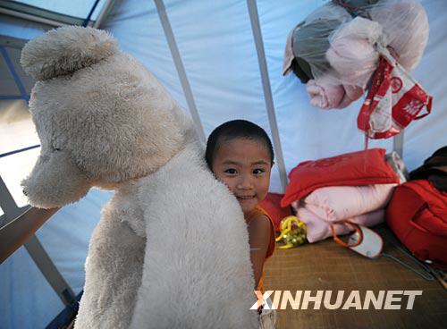 7月8日,在四川安縣雎水鎮(zhèn)罐灘村,3歲孤兒林帝丞在帳篷內(nèi)玩志愿者送來(lái)的玩偶。新華社記者 聶建江攝