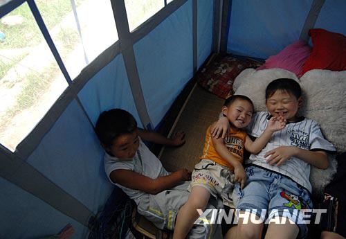 7月8日,在四川安縣雎水鎮(zhèn)罐灘村,3歲孤兒林帝丞(中)在帳篷內(nèi)與小伙伴玩耍。新華社記者 金良快攝