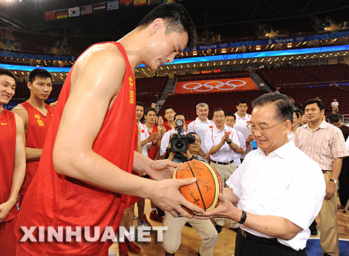 在奧運小組賽中,中國男籃首場將迎戰實力雄厚的美國隊。溫家寶說,我小時候也是個籃球運動愛好者。我最愛看籃球賽。你們的第一場比賽就舉世關注,要有信心,沉住氣,把球打好,不管輸贏,首先要有精神。他贈給中國男籃一句話:要用精彩的比賽為祖國贏得榮譽,贏得尊嚴,贏得友誼,表現出中國人民的精神風貌。他還向所有的中國籃球運動員問好,并通過大家向全體參加奧運會的中國運動員問好。離開前,姚明代表中國男籃向總理贈送了一個簽有隊員名字的籃球?偫硪矐谧约簞偛糯蜻^的籃球上簽名留念。