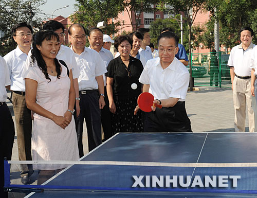 這是溫家寶在豐臺區大井社區和群眾打乒乓球。新華社記者黃敬文攝