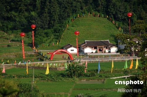 八月十三日,中國國民黨主席吳伯雄祖籍地--福建永定縣下洋鎮思賢村里的吳氏宗祠周邊,彩旗、彩球、條幅飄揚,喜氣洋洋,等候吳伯雄第二次回鄉謁祖。繼二000年十一月首次祭祖后,吳伯雄一行十四日上午將再次回到思賢村謁祖。 中新社發 鄭祚聲 攝