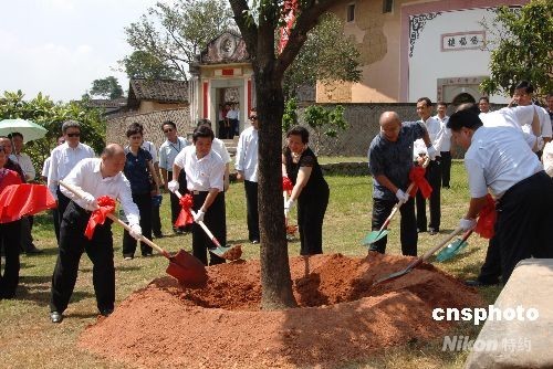 八月十四日下午,中國(guó)國(guó)民黨主席吳伯雄一行在福建永定縣高北土樓群的“土樓王”承啟樓前種下一棵香樟樹(shù),紀(jì)念此次祖地之行。 中新社發(fā) 鄭祚聲 攝
