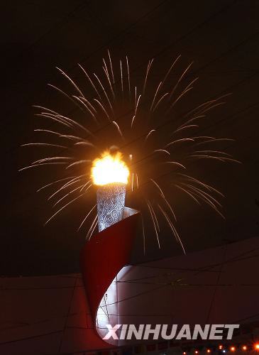 8月8日,第29屆夏季奧林匹克運動會在國家體育場隆重開幕。這是點燃后的主火炬塔在國家體育場上空燃燒。新華社記者廖宇杰攝