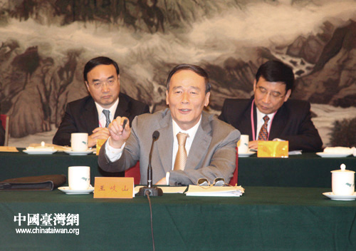 王岐山指出,今年以來,臺灣局勢發(fā)生重大積極變化,擴(kuò)大和深化兩岸經(jīng)濟(jì)交流合作面臨難得的歷史機(jī)遇。兩岸在“九二共識”基礎(chǔ)上恢復(fù)協(xié)商,在“建立互信、擱置爭議、求同存異、共創(chuàng)雙贏”的原則指引下,兩岸周末包機(jī)、大陸居民赴臺旅游順利實(shí)施。兩岸經(jīng)濟(jì)相互融合日益加深,經(jīng)濟(jì)交流合作不斷擴(kuò)大。兩岸同胞要抓住機(jī)遇,繼續(xù)加強(qiáng)經(jīng)濟(jì)文化交流,拓展合作領(lǐng)域,提高合作層次,盡快實(shí)現(xiàn)直接“三通”,促進(jìn)兩岸各領(lǐng)域交流合作邁上新臺階,推動兩岸關(guān)系和平發(fā)展。