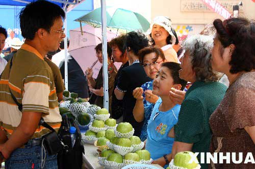 2007年7月,2007臺灣優(yōu)質(zhì)農(nóng)產(chǎn)品巡回展在遼寧大連開幕,來自臺灣的菠蘿、木瓜、芒果、茶葉等農(nóng)產(chǎn)品參展。 新華社記者 任勇 攝