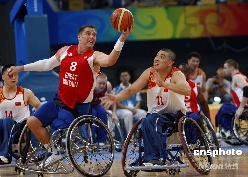 9月7日,北京殘奧會輪椅籃球比賽在北京國家體育館舉行,中國隊以34比81的比分不敵英國隊。圖為中國隊11號選手曲煥健與英國8號選手西蒙-芒恩激烈爭球。 中新社發 杜洋 攝