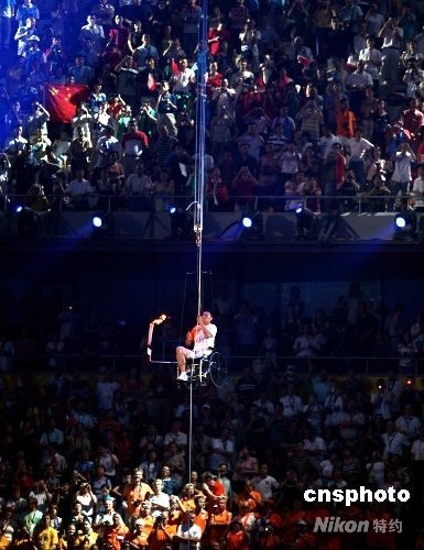 9月6日晚,北京2008殘奧會開幕式在國家體育場“鳥巢”舉行。在萬眾矚目下,殘奧會田徑金牌獲得者、火炬手侯斌,坐輪椅拉繩索攀升去點燃鳥巢上方的北京殘奧會主火炬。 中新社發 宋吉河 攝