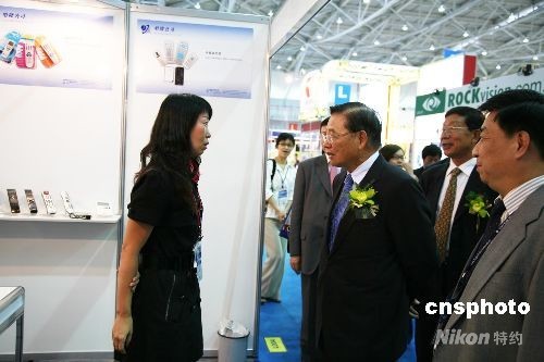十月七日,二00八年海峽兩岸電子展在臺北世貿中心南港展覽館舉行,“;鶗倍麻L江丙坤出席開幕典禮,對大陸企業來臺參展表示歡迎,希望兩岸經貿合作更加緊密,期待大陸人員今后來臺不必繞道。來自大陸的一百五十余家企業、經貿團體分參展團與觀展團參加此次電子展,臺灣參展企業達千余家。大陸與臺灣參展企業數與參展人數均創歷年之最。 中新社發 楊旭 攝
