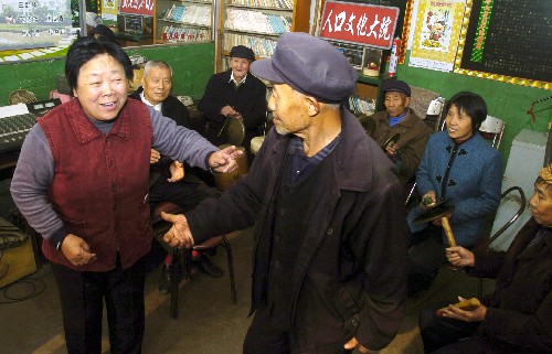 文化館、圖書館等公益性文化單位不斷完善設(shè)施與服務(wù),為群眾準(zhǔn)備豐盛的活動(dòng)項(xiàng)目;文化共享工程為農(nóng)民群眾拓寬致富路,數(shù)字化放映讓更多農(nóng)民看上好電影;自辦文化大院等群眾自發(fā)文化活動(dòng),為基層文化生活增添亮色……十六大以來,我國(guó)農(nóng)村文化生活日益豐富,農(nóng)民群眾文化權(quán)益得到保障。 這是2007年11月14日,山西祁縣城趙鎮(zhèn)里村“麻萬全文化大院”的成員正在開展活動(dòng)(資料照片)。 新華社發(fā)