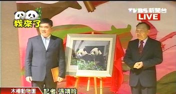 贈臺大熊貓“團團”、“圓圓”照片及基因祖譜贈送儀式今天在臺北舉行,圖左為臺北市長郝龍斌。來源:臺灣TVBS電視臺