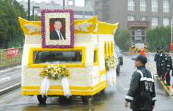行駛在陣陣細雨中的靈車,采傳統的黃、白菊花裝飾,跟著后頭的家屬車輛,也沒有任何裝飾,要不是靈車前方王永慶的遺照,光從排場,實在看不出里面載著的是臺灣“經營之神”的棺木。(高大林)