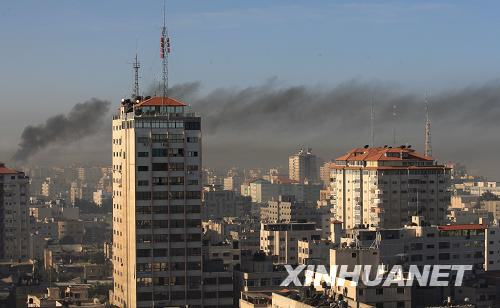 1月15日,加沙城遭到以色列軍隊襲擊后升起滾滾濃煙。加沙地帶巴勒斯坦急救部門說,以軍當日凌晨開始從加沙城南部向市中心推進,至當天上午,有約30名巴勒斯坦人喪生,以軍對加沙地帶的軍事打擊造成的死亡人數已升至1060人。新華社記者納賽爾攝