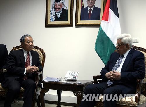 1月15日,中國中東問題特使孫必干(左)在約旦河西岸城市拉姆安拉會見巴勒斯坦民族權力機構主席阿巴斯。為推動加沙緊張局勢走向緩和,中國中東問題特使孫必干12日開始訪問埃及、以色列和巴勒斯坦,為緩和加沙局勢、緩解加沙人道主義危機而努力。新華社記者齊湘輝攝