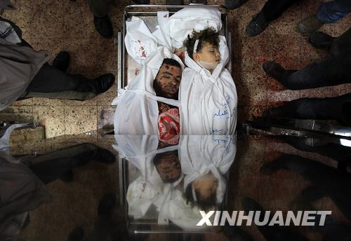 1月15日,在以軍襲擊中喪身的一對(duì)巴勒斯坦父子的尸體停放在加沙城的希法醫(yī)院。以色列軍隊(duì)對(duì)加沙地帶發(fā)動(dòng)的“鑄鉛行動(dòng)”15日進(jìn)入第20天。加沙地帶巴勒斯坦急救部門(mén)說(shuō),以軍當(dāng)天凌晨開(kāi)始從加沙城南部向市中心推進(jìn),至當(dāng)天上午,有約30名巴勒斯坦人喪生,以軍對(duì)加沙地帶的軍事打擊造成的死亡人數(shù)已升至1060人。新華社記者納賽爾攝