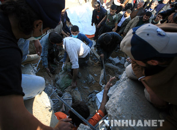 1月18日,在加沙城東部,巴勒斯坦人從廢墟中挖出一名遇難兒童的遺體。以色列總理奧爾默特當(dāng)日說,盡管以方已在加沙地帶實(shí)施單邊停火,但如果巴勒斯坦有關(guān)武裝派別不停止火箭彈襲擊,以方有權(quán)重新展開軍事行動(dòng)。新華社記者納賽爾攝