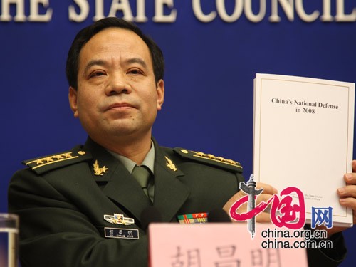 國務院新聞辦公室于1月20日上午10時在京舉行了新聞發布會,介紹2008年中國的國防白皮書,并回答了記者提問。 圖為國防部新聞發言人、國防部新聞事務局局長胡昌明大校。中國網 胡迪