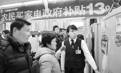 一名售貨員在南京高淳縣向農(nóng)村消費者介紹家電下鄉(xiāng)指定產(chǎn)品。(來源:人民日報海外版)