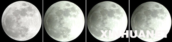 圖為用相同光圈和快門速度拍攝的半影月食(從左至右)。新華社記者公磊攝