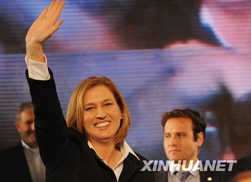 據以色列《新消息報》12日報道,最終計票結果顯示,以外交部長利夫尼領導的中間派政黨前進黨獲得議會120個席位中的28席,贏得第18屆議會選舉。圖為以色列外長、前進黨主席利夫尼在特拉維夫的慶祝集會上向支持者揮手致意(2月11日攝)。新華社記者殷博古攝