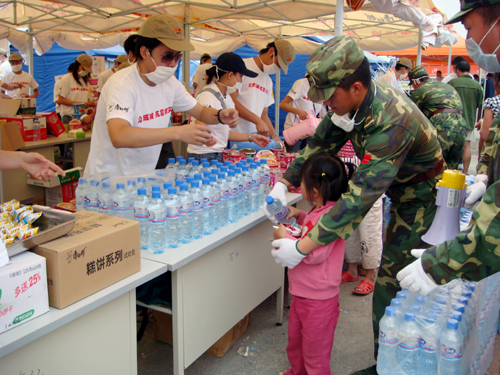 汶川地震期間,頂新集團送去食物、飲用水等救災物資,和災區(qū)人民共度難關。(頂新集團提供)