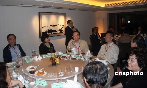 自兩岸交流以來層級最高的大陸中央媒體負責人訪問團三月十九日晚抵達臺北。圖為臺灣中國新聞學會在臺北喜來登飯店為代表團舉行歡迎晚宴。 中新社發 耿軍 攝