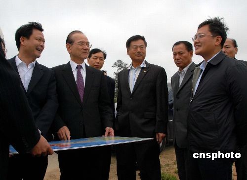 3月28日,中國國民黨副主席林豐正伉儷一行回到祖籍地福建漳浦的石榴鎮盤龍村祭祖、參訪。圖為林豐正(左二)參觀古雷港經濟開發區及建設中的一德石化碼頭。 中新社發 藍智偉 攝