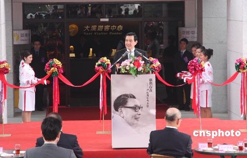 步出陵寢大門,穿過馬路,馬英九又在桃園縣長朱立倫的陪同下來到大溪游客中心,為在這里舉辦的“蔣經(jīng)國先生百年誕辰特展”剪彩。