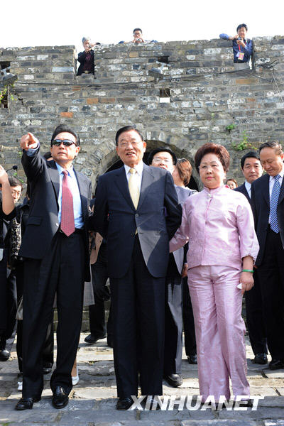 4月25日,臺灣海基會董事長江丙坤和夫人在海協會會長陳云林陪同下參觀南京明城墻。新華社記者韓瑜慶攝