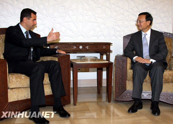 4月26日,敘利亞總統(tǒng)巴沙爾(左)在大馬士革會(huì)見中國外長楊潔篪。新華社記者拱振喜攝