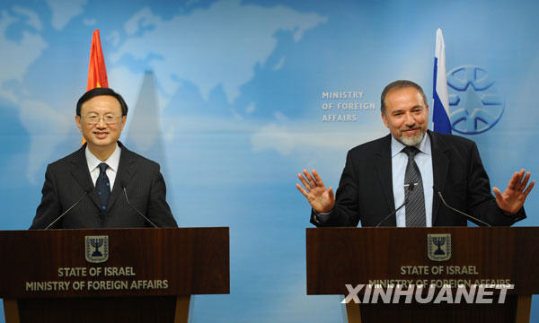 4月23日,以色列外交部長利伯曼(右)與到訪的中國外交部長楊潔篪在耶路撒冷會(huì)見后共同舉行新聞發(fā)布會(huì)。新華社記者殷博古攝
