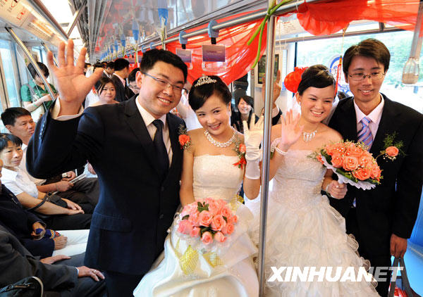 5月13日,新人們在南京的地鐵列車上舉行集體婚禮。 當日,“越時空之旅”海峽兩岸地鐵集體婚禮在南京舉行。來自江蘇省內的15對新人登上10時58分由南京地鐵邁皋橋站始發的婚車專列,與其他乘客共同分享幸福時刻。據介紹,這是兩岸首次合作舉辦地鐵集體婚禮,新人們將先后在南京地鐵與臺灣高雄捷運舉行婚典儀式。15日,新人們將赴臺灣度蜜月,游覽寶島風光。新華社記者 孫參 攝 |
