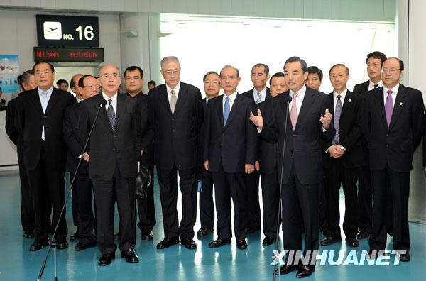 6月1日,中共中央臺辦主任王毅(前右)到機場為吳伯雄一行送行。