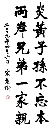 新華網河南頻道6月18日訊 鄭州日報報道:昨日,鄭州黃河風景名勝區收到一份寄自寶島臺灣的珍貴“禮物”——親民黨主席宋楚瑜先生親筆手書的“炎黃子孫不忘本 兩岸兄弟一家親”。14個遒勁有力的大字,蘊含著祖國寶島炎黃子孫認祖歸宗的強烈情感。