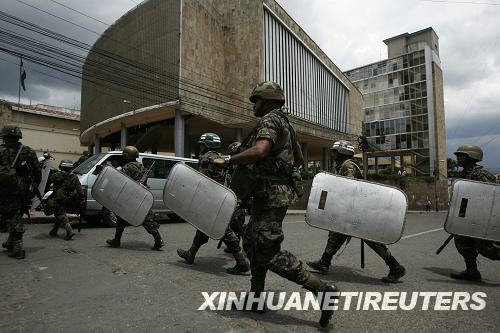 6月28日,在洪都拉斯首都特古西加爾巴,士兵抵達(dá)議會(huì)大樓。洪都拉斯議會(huì)正在此召開緊急會(huì)議,討論該國(guó)當(dāng)前的政治形勢(shì)。洪都拉斯最高法院28日宣布對(duì)現(xiàn)任總統(tǒng)曼努埃爾·塞拉亞的罷免決定,并稱28日凌晨洪都拉斯軍方拘押及強(qiáng)行驅(qū)逐總統(tǒng)的行為合法。 新華社/路透