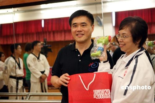 六月二十六日,臺北市市長郝龍斌訪港,到港灣道體育館參觀“09年臺北聽奧運動會”香港代表團選手訓練。郝龍斌向香港跆拳道選手贈送“09年臺北聽奧運動會”吉祥物。 中新社發 洪少葵 攝