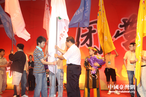 全國臺聯會長梁國揚代表全國臺聯收回本屆夏令營總營旗。(中國臺灣網 張蕾 攝)