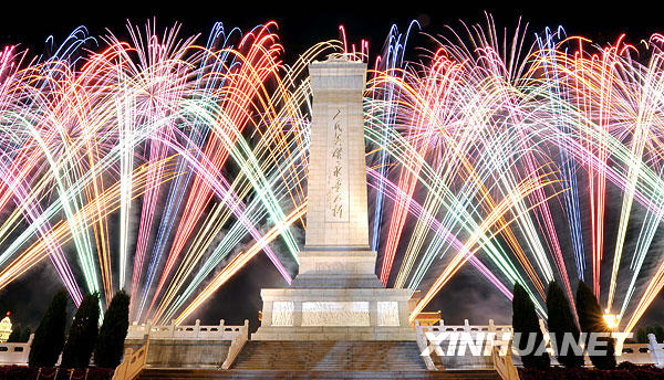 10月1日,首都各界慶祝中華人民共和國成立60周年聯歡晚會在北京天安門廣場舉行。這是天安門廣場燃放煙花。新華社記者王毓國攝