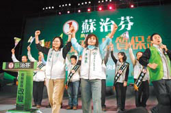 蘇治芬萬人造勢會,主席蔡英文(左)聯(lián)手為該黨“三合一”候選人輔選。圖片來源:臺灣《中國時報》