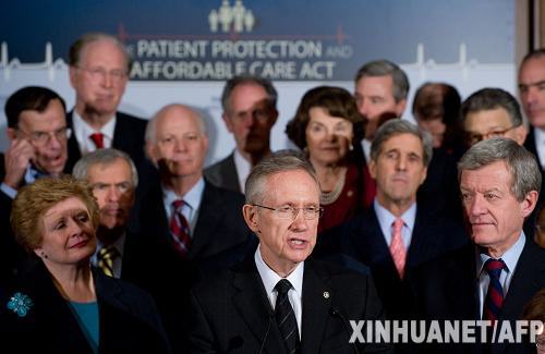 12月23日,在美國首都華盛頓,參議院多數黨(民主黨)領袖哈里·里德(前中)在參議院就醫療改革法案進行最終一輪投票前舉行的新聞發布會上發言。美國國會參議院24日清晨投票通過了美國總統奧巴馬支持的全面醫療改革法案。法案的核心是創建一個聯邦監管的醫療保險市場,而政府將成立公共保險機構出售醫療保險。新華社/法新