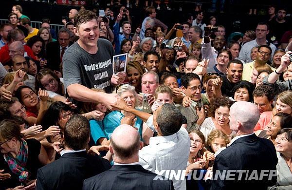 9月12日,在美國明尼蘇達州的明尼阿波利斯,美國總統奧巴馬(下,中)發表關于醫療改革方案的演講后與一名身高達2.3米的支持者握手。當天,奧巴馬向過萬名現場聽眾闡述醫療改革方案。他還指責反對醫改者利用“恐嚇手法”阻撓改革。新華社/法新