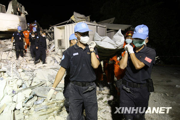 1月16日,在海地太子港,中國維和警察防暴隊隊員在聯合國駐海地穩定特派團倒塌大樓現場抬出一具中方失蹤人員遺體。當日,中國國際救援隊在海地太子港地震現場挖掘出一具中方失蹤人員遺體,并舉行了簡短的現場默哀儀式。新華社記者 袁滿 攝