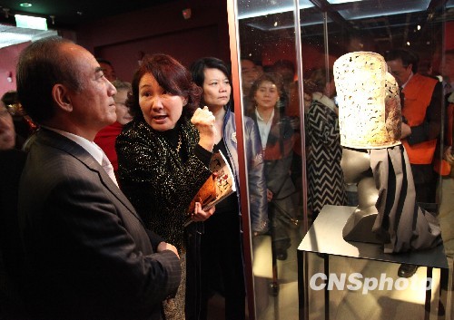 2月6日,“黃金旺族——內(nèi)蒙古博物院大遼文物展”在臺(tái)北故宮博物院正式對(duì)公眾開(kāi)放。此次展出的115組以契丹黃金文物為主的稀世珍寶中有57件是大陸一級(jí)文物。這是臺(tái)灣歷年來(lái)舉辦大陸文物展頂級(jí)珍寶數(shù)量最多的一次。圖為臺(tái)灣“立法院”院長(zhǎng)王金平(左一)觀看展出的陳國(guó)公主墓出土的珍貴文物“公主銀鎏金高翅冠”。 中新社發(fā) 耿軍 攝