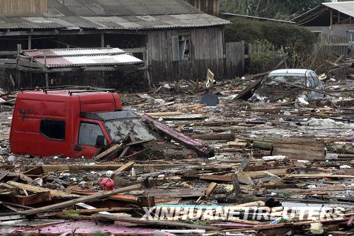 2月28日,智利佩尤韋附近海岸在地震后一片狼藉。智利總統巴切萊特28日下午宣布,強烈地震已經使該國造成708人死亡。新華社/路透