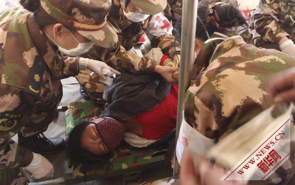 4月17日,一名剛被救出不久的結古鎮傷員被送到武警青海總醫院臨時救助點接受治療。青海玉樹地震發生以來,來自解放軍、武警部隊醫院的多支軍醫救護隊在玉樹搭建起臨時救助點對災區傷病員進行搶救和治療,成為災區生命的救助站。新華社發(郭國權 攝)