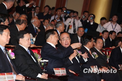 4月20日上午,2010臺(tái)灣·湖北(武漢)周在臺(tái)北圓山大飯店開(kāi)幕。中國(guó)國(guó)民黨榮譽(yù)主席連戰(zhàn)(前排左三)、吳伯雄(左四),臺(tái)灣海基會(huì)董事長(zhǎng)江丙坤、臺(tái)灣工業(yè)總會(huì)理事長(zhǎng)陳武雄等人出席并致辭,左二為首度訪臺(tái)的中共湖北省委書(shū)記羅清泉。 中新社發(fā) 董會(huì)峰 攝
